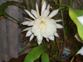 その名の通り夕方6時頃から咲き始め2時間くらいで満開になりました。まっ白でその妖艶な姿は名に恥じない美しくも妖しげなものでした。花の中を覗き込むと薄く黄色味かかった、おしべとめしべが踊っているようです。木なのか草なのかよく分らない植物で、幅広の葉の葉脈のような所から次々と次の葉を伸ばして幹がない。サボテンの親類の様な物でしょうか。華麗な純白の花も翌朝にはもう萎んでしまって夜のうちに短い花の命を全うしてしまいました。