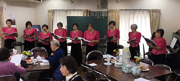 まず艶やかな演奏会衣装のグループが登場されると場がパッと華やかに!グループの成り立ちなどのお話から、最初はコーラス「ずいずいずっころばし」から始まる楽しい選曲。ピアノ伴奏の息もピッタリ。みなさんと一緒に「花」から一緒に歌い♪春のうら〜ら〜の〜♪と季節もピッタリ。軽妙な司会進行であっという間にティータイム。