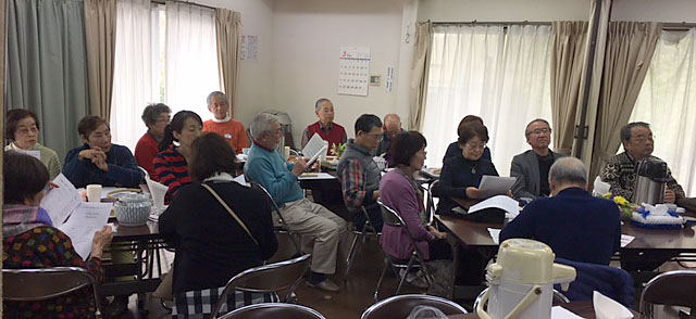 ここで「井戸端会議」のご紹介。今回、テーブルやお茶の設置方法は井戸端会議にならいました。緑茶、コーヒー、「生姜のおかか炊き」のカナッペも用意して頂き、レシピもご紹介頂きました。さらにハーブティー、飴にお菓子と盛り盛りでした。日常で気が付いた卵のへぇ〜情報や100均の便利容器情報も紹介。 まったり〜と時が過ぎそうなので、そろそろ「こーるこすもす」さんにバトンタッチ。 後半も懐かしい歌あり、輪唱あり、勇まくも難解な歌あり、盛り沢山で、最後は「ふるさと」でしめくくって頂きました。