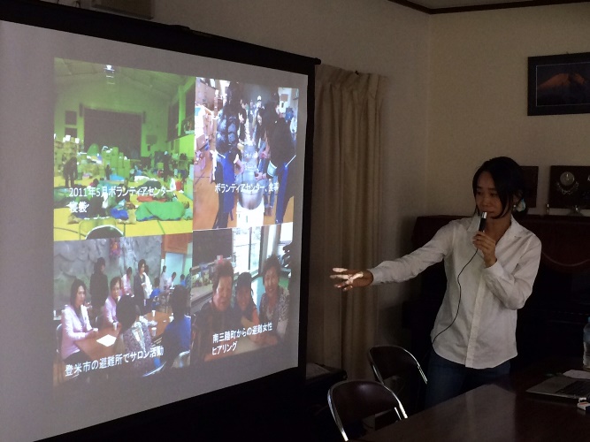 6月24日のティールームでは、『日ごろのコミュニティが違いをつくる 〜南三陸町で震災から4 年の活動を経て鎌倉に伝えたいこと〜』をテーマに、宮城県南三陸町で支援活動を継続するNPO法人「ウィメンズアイ」(通称WE)の代表 石本めぐみさんに講演していただきました。