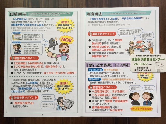 ティータイムをはさみ鎌倉市消費生活センターからのお話。平成27年度の相談件数は約1600件! でもこれは氷山の一角、被害にあっても相談できる方は4%、つまり実際は4万人、鎌倉の約4人にひとりの被害があると言われています。鎌倉で多いのは必ず儲かるなどと投資させ老後の資産をねらう利殖商法! その他高額のリフォーム(耐震、屋根、塗装)契約を迫る点検商法など…シニアの3K:金、健康、孤独につけ込む商法が増えているので、すぐに玄関を開けず、インターフォン越しに、断る時ははっきり「関心ありません!」と。また近年はインターネット閲覧中にいきなり料金請求画面が消えなくなるウイルス感染トラブルも増加、絶対相手に連絡せず、先ずは下記に相談を。 鎌倉市消費生活センター案内は http://www.city.kamakura.kanagawa.jp/seikatu/center.html